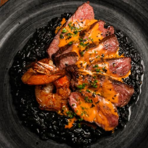 A proposta principal desse prato é de ser “surf and turf”, ou seja, um prato que traz sabores da terra e do mar. Baby beef super macio e suculento e camarões G são as estrelas, servidos com risoto Nero di Sépia e finalizado com molho à base de pimenta siracha. É a união harmoniosa da cozinha clássica do Pesto com a cozinha asiática Descubra o prato especial de Março no Pesto. #SejaPesto 🧡